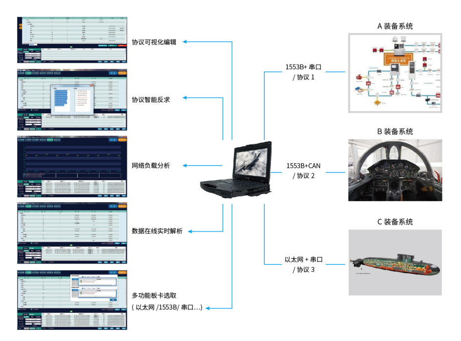 数字化网络(如以太网、1553B 总线、串口、CAN 总线等)在复杂装备体系系统中占有不可或缺的核心地位,是设备之间进行指令传达、数据传输、信息交互的基础。在整个装备系统的集成联调、试验和维修保障过程中,对数字化网络的监控、解析、记录与分析具有十分重要的意义。为面向各类复杂装备的网络特点,提高系统网络分析、诊断的能力,我公司自主研制了异构装备网智能分析平台,可针对不同装备系统网络异构和协议定制化的特点,提供包括协议可视化编辑、异构网络(以太网、1553B 总线、CAN 总线、串口、B 网络)数据采集、记录、解析、信号模拟、故障定位、网络拓扑分析、流量分析等服务,通过对数字化网络的分析,以提升装备在集成联调、试验、维修保障中的效率。