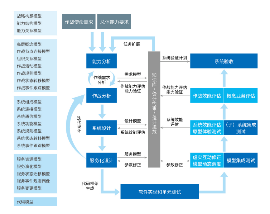 ENGE-MDDTOOL 充分结合 DODAF2.0 和模型动的系统工程方法,基于语义元模型扩展技术,辅助体系设计人员从能力视图、作战视图、系统视图、服务视图、技术视图、数信视图、工程视图及全视图等不同视角出发,开展面向领域的使命分析、作战任务分析、体系架构设计、服务化设计等复杂装备体系设计,生成 XMI 设计模型、设计报告、试验想定、作战规则、状态机、软件代码等模型。