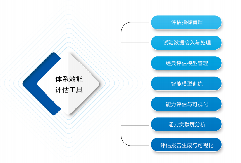 面向复杂装备体系系统具有复杂性、关联性、涌现性等特征,构建面向任务的体系效能评估工具,通过集成 AHP、ANP、TOPSIS 等经典效能评估和深度神经网络、机器学习等智能评模型,为装备系统评估人员提供包括效能评估指标体系构建、效能指标建模、试验数据接入和处理、面向任务的效能评估分析、智能模型训练、作战效能灵敏度分析、系统效能贡献度分析等服务。能够与体系设计平台、服务化仿真平台实现无缝的结合,旨在对体系效能、系统效能和作战效能的有效评估,进而提升体系设计、系统设计的能力和质量。